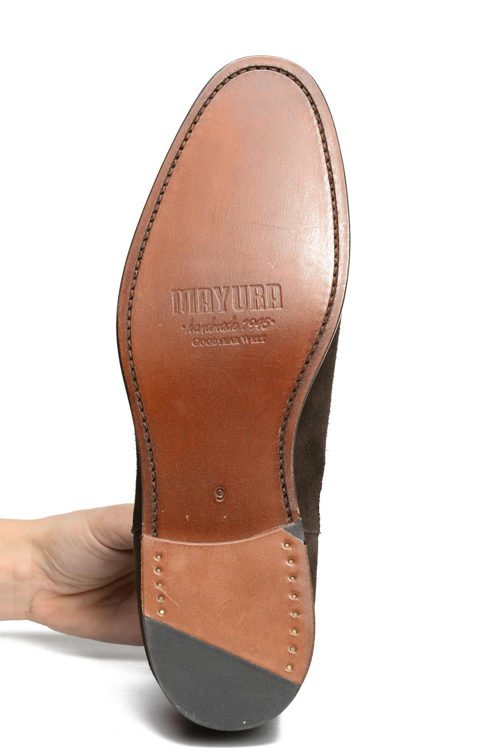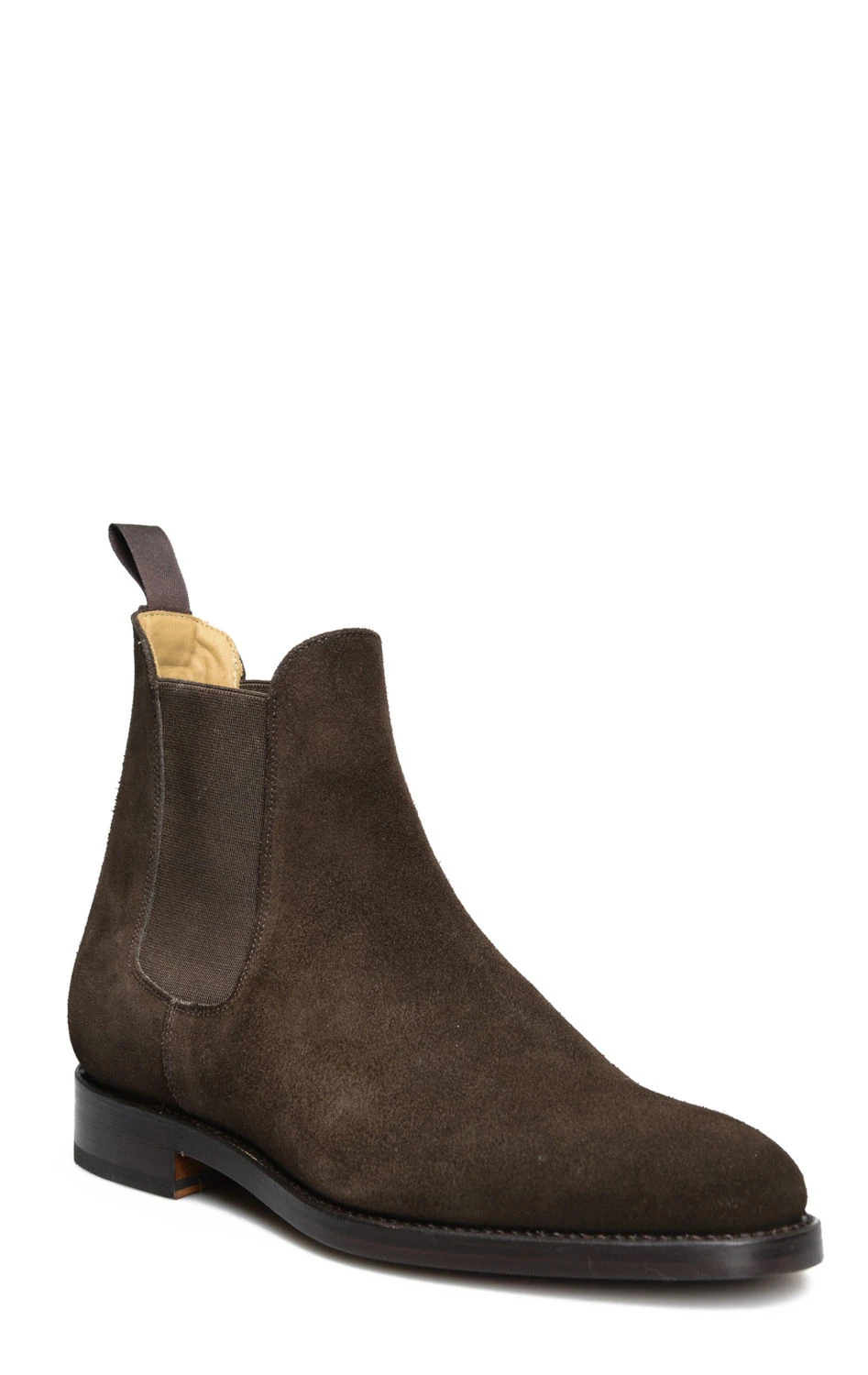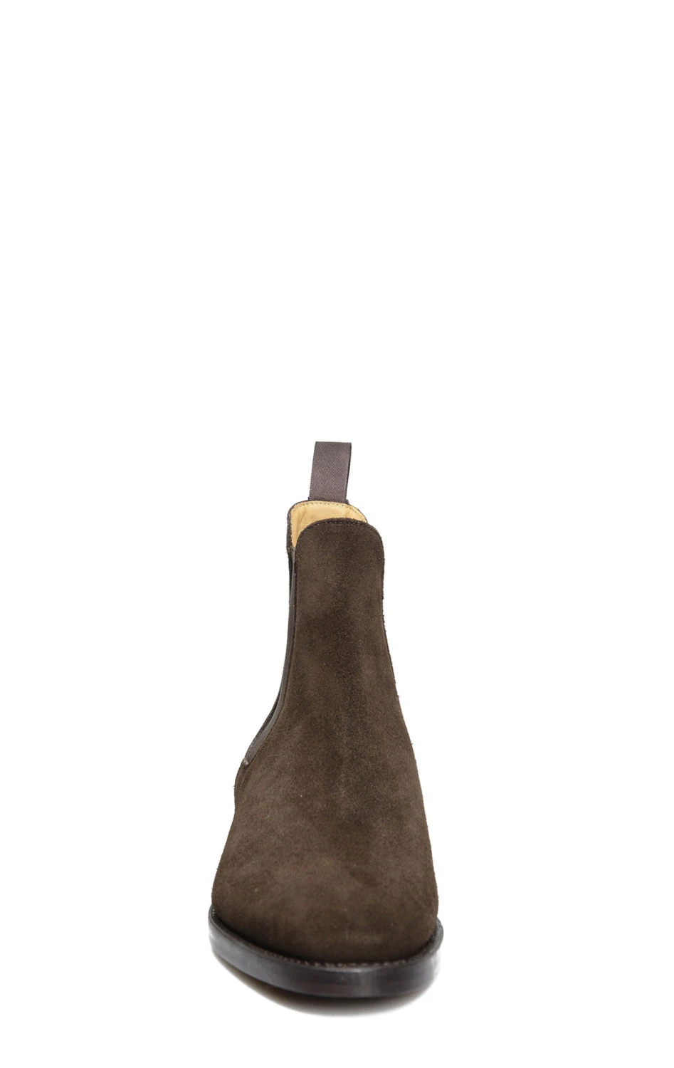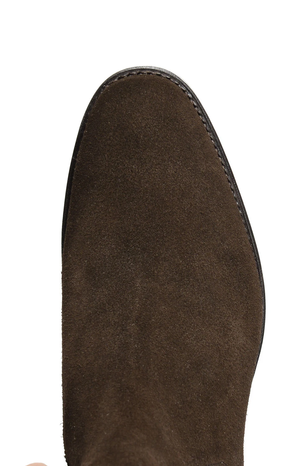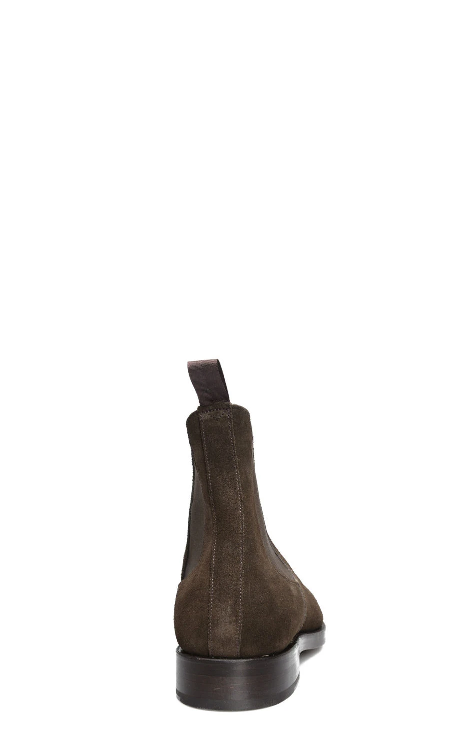 Stivale confezionato in pelle genuina di scamosciata di colore moka, completamente rifinito all’interno in fior di pelle e con suola in cuoio.