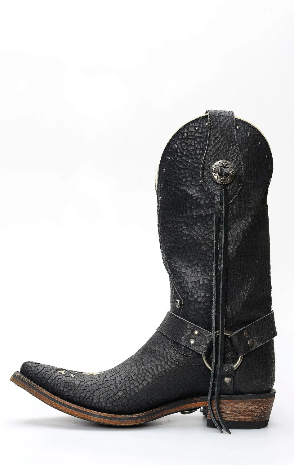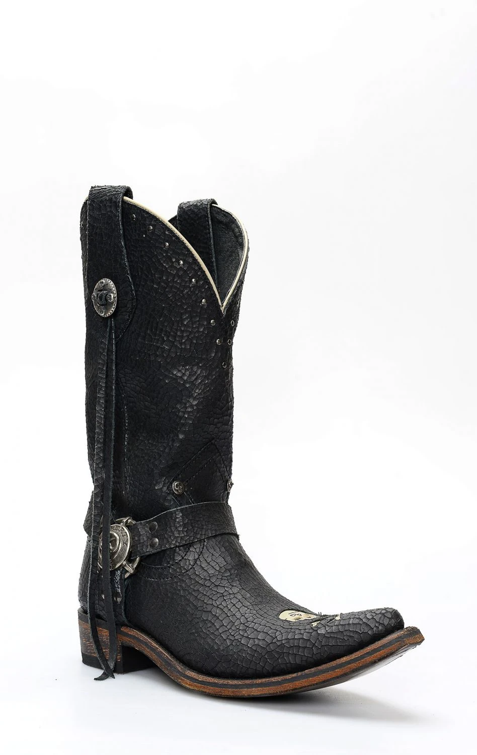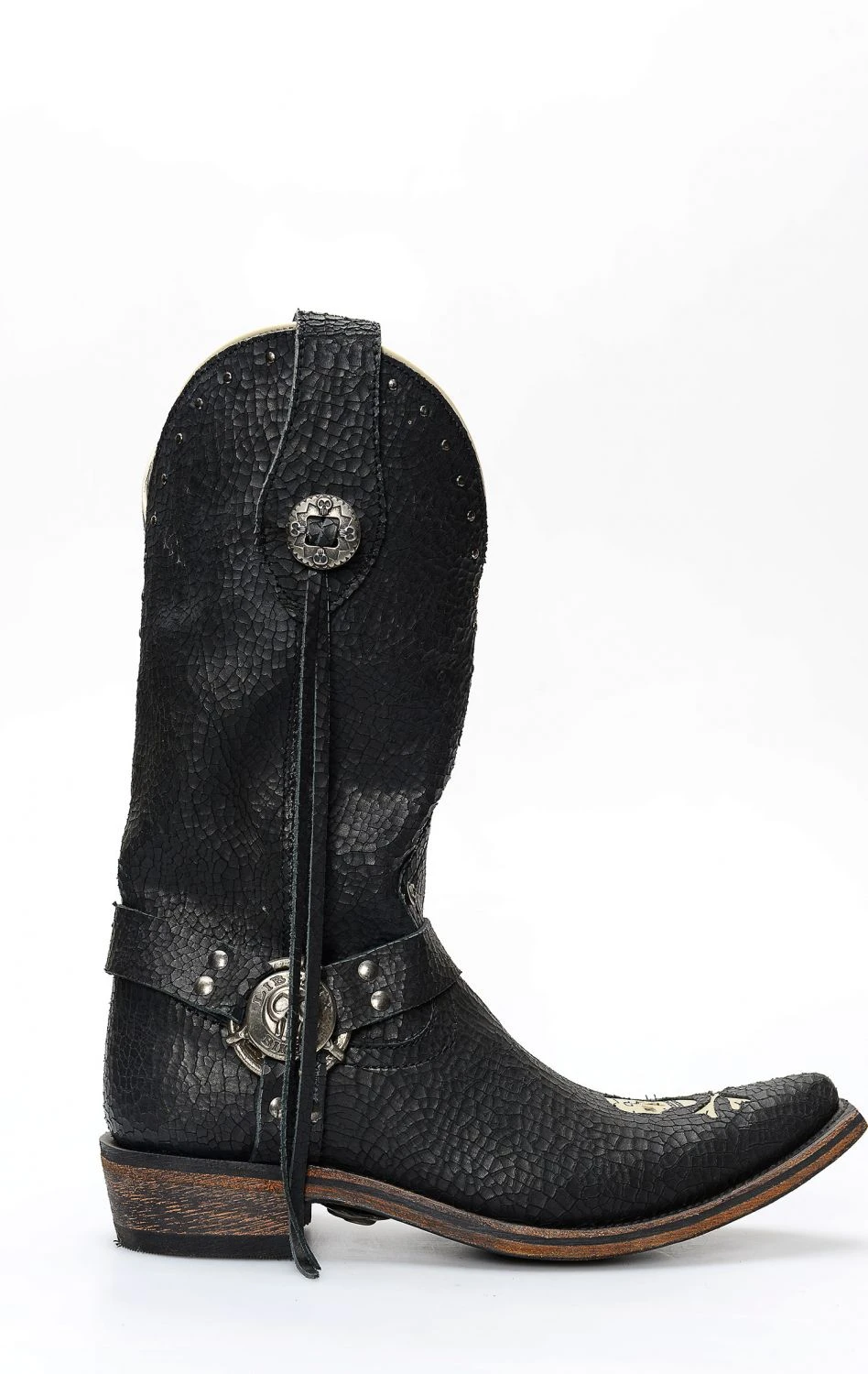 Stivali Liberty Black in pelle invecchiata nera con spettacolare inserto a forma di teschio. Texano dal tocco biker. Stivale senza compromessi.