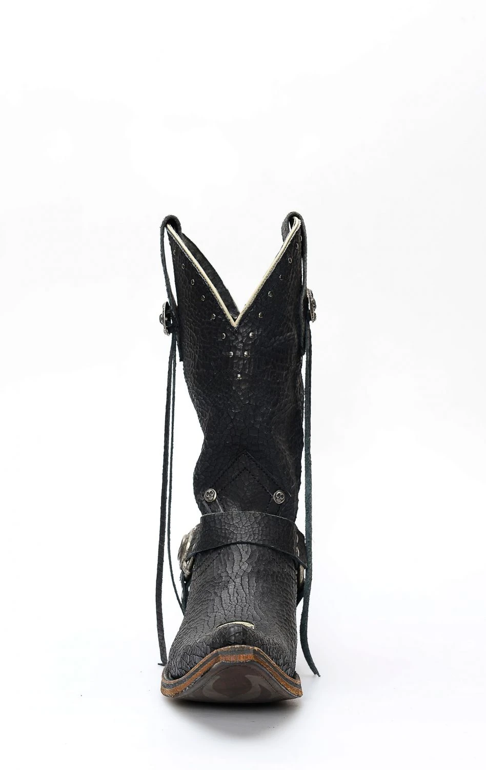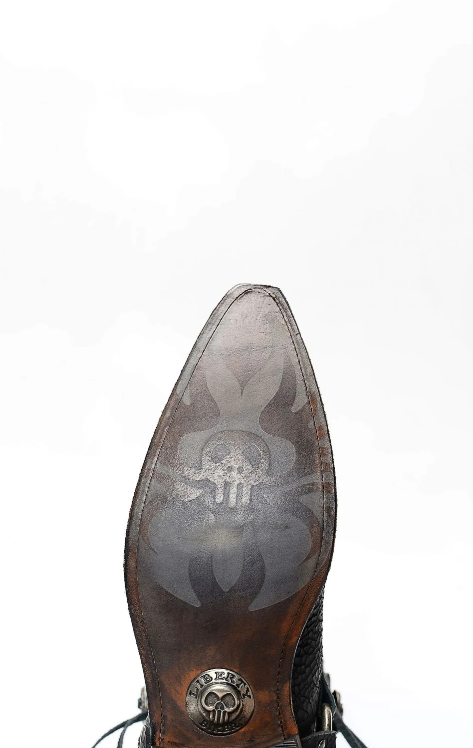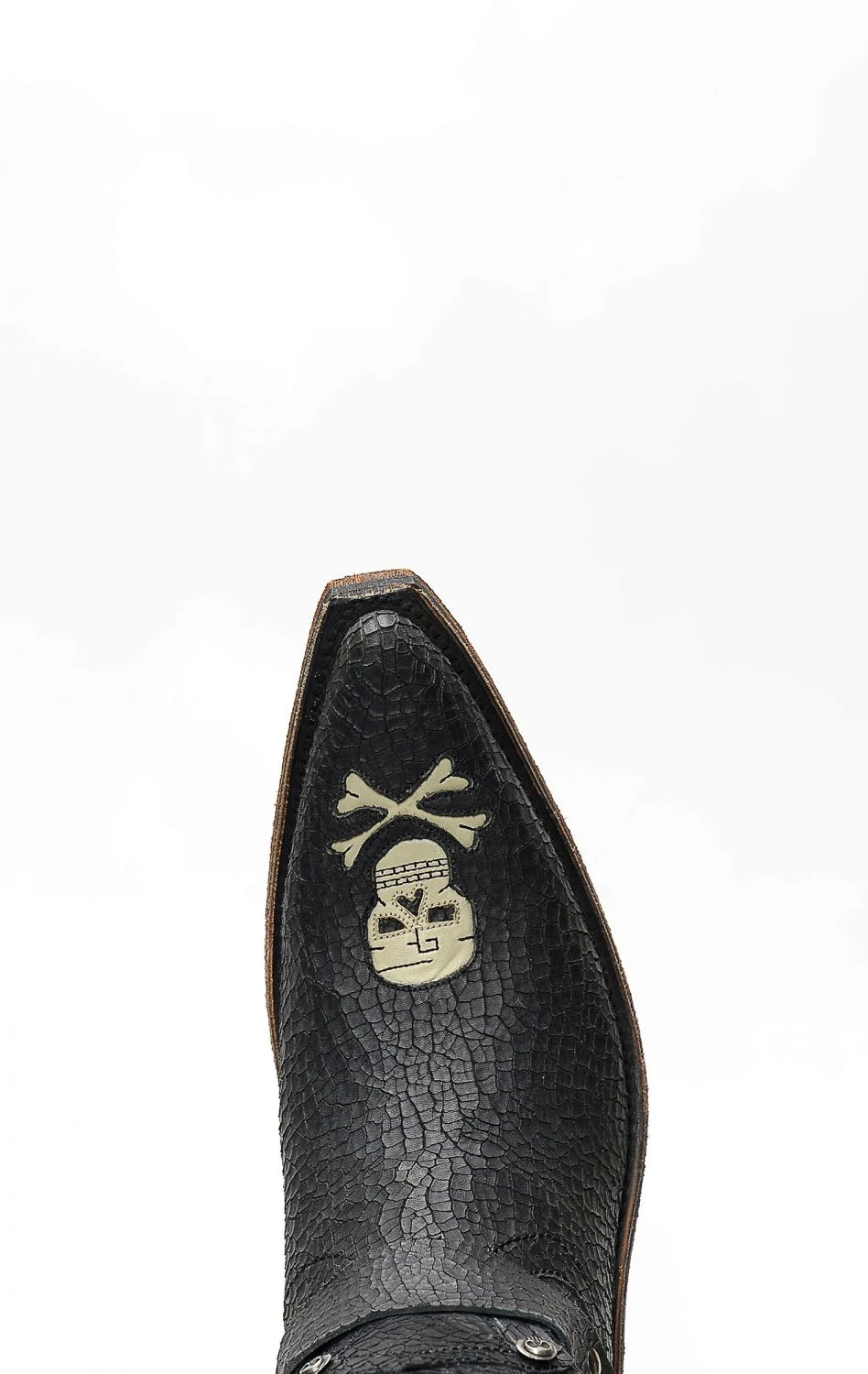 Stivali Liberty Black in pelle invecchiata nera con spettacolare inserto a forma di teschio. Texano dal tocco biker. Stivale senza compromessi.