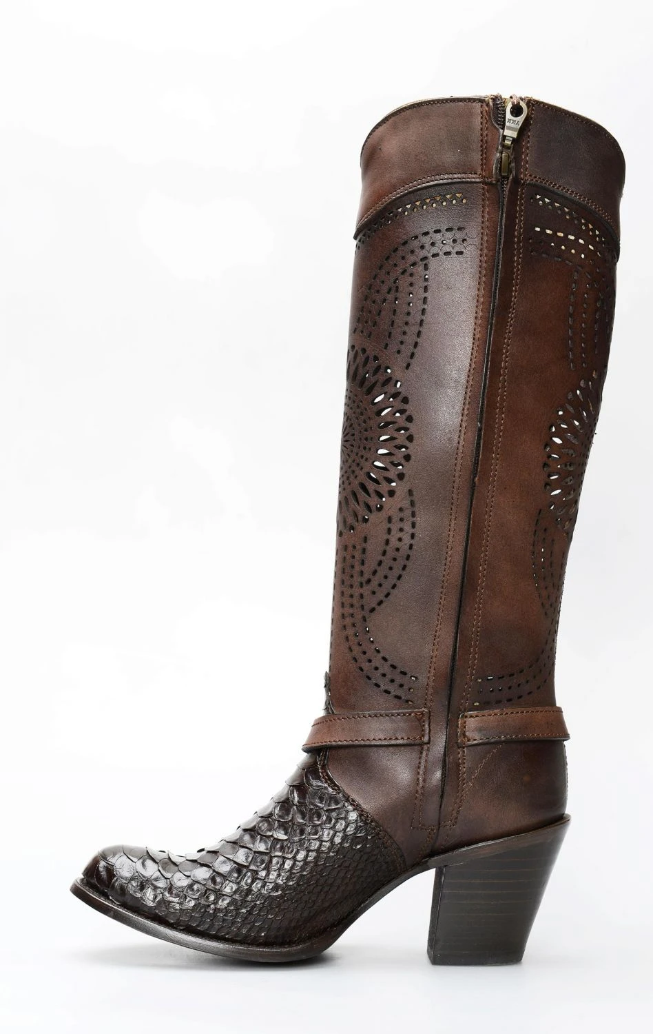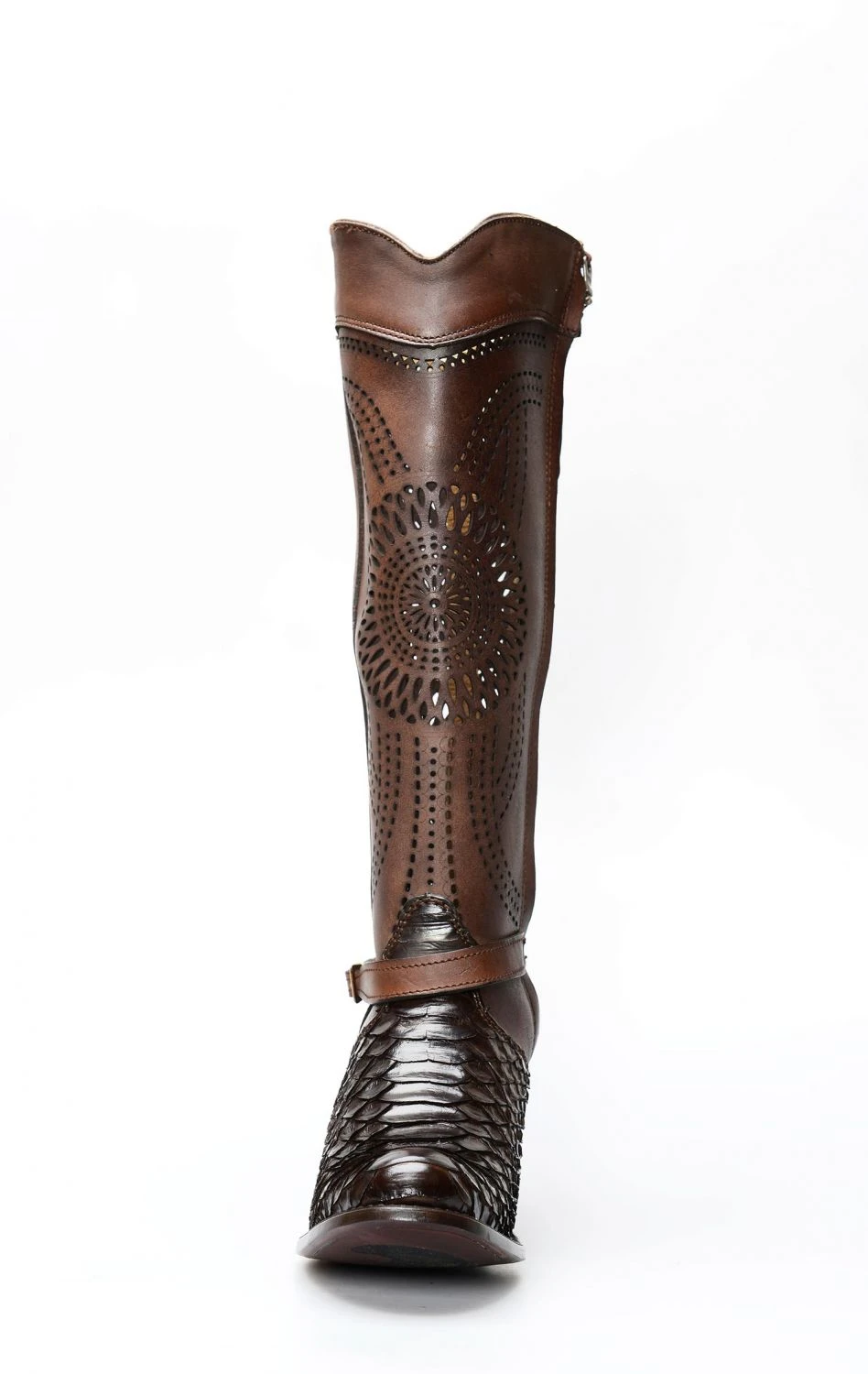 Stivali Cuadra donna in pelle di pitone testa di moro. Splendida versione con gambale traforato e tacco alto. Deciso ma elegante.