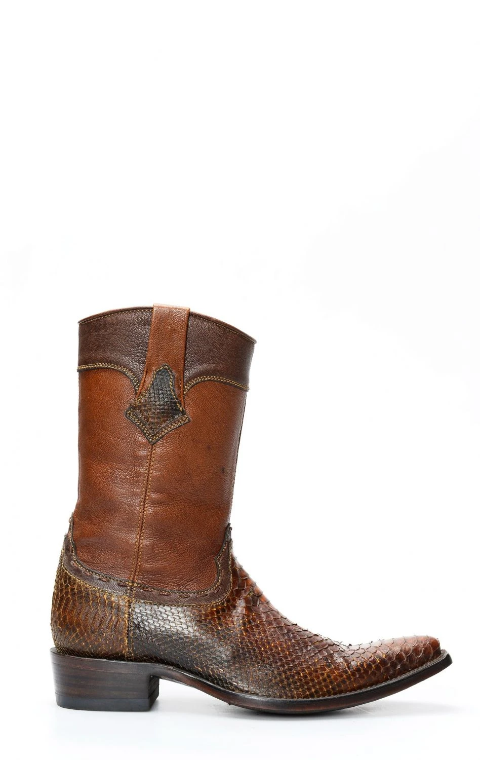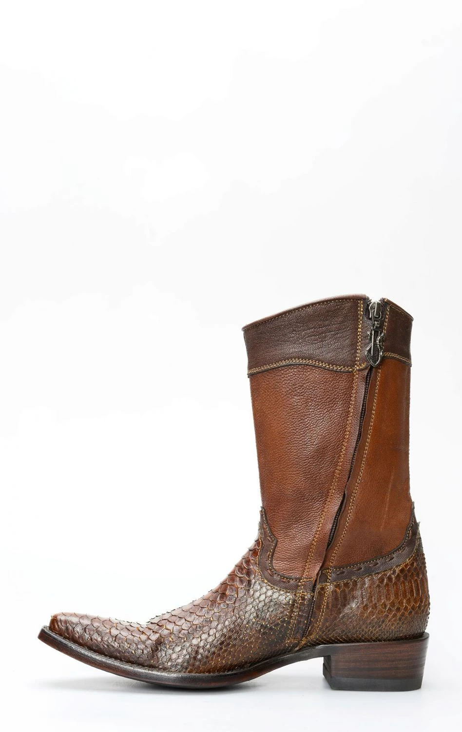 stivale confezionato in vera pelle esotica, importata con regolare e speciale certificazione cites, di pitone di colore testa di moro, completamente rifinito all’interno in fior di pelle e con suola in cuoio.