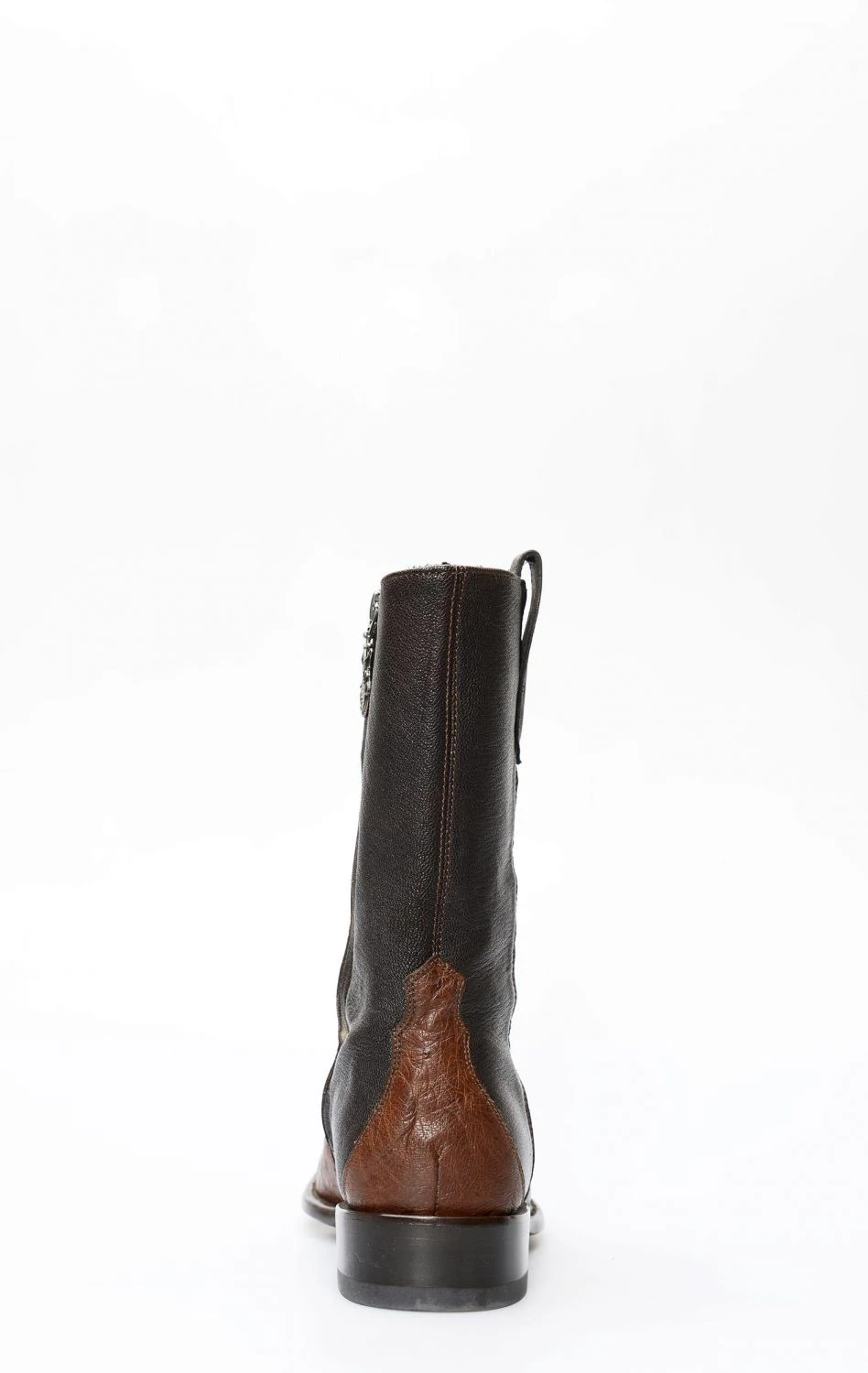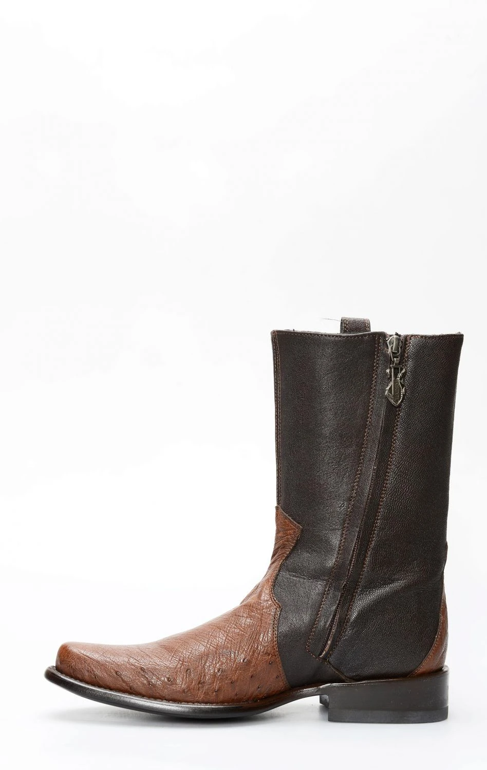stivale confezionato in vera pelle esotica, importata con regolare e speciale certificazione cites, di pancia di struzzo di colore marrone chiaro, completamente rifinito all’interno in fior di pelle e con suola in cuoio.