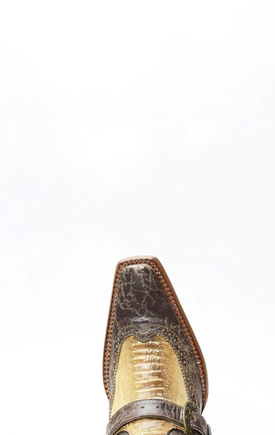stivale confezionato in vera pelle esotica, importata con regolare e speciale certificazione cites, di gamba di struzzo di colore marrone chiaro sfumato, completamente rifinito all’interno in fior di pelle e con suola in cuoio.
