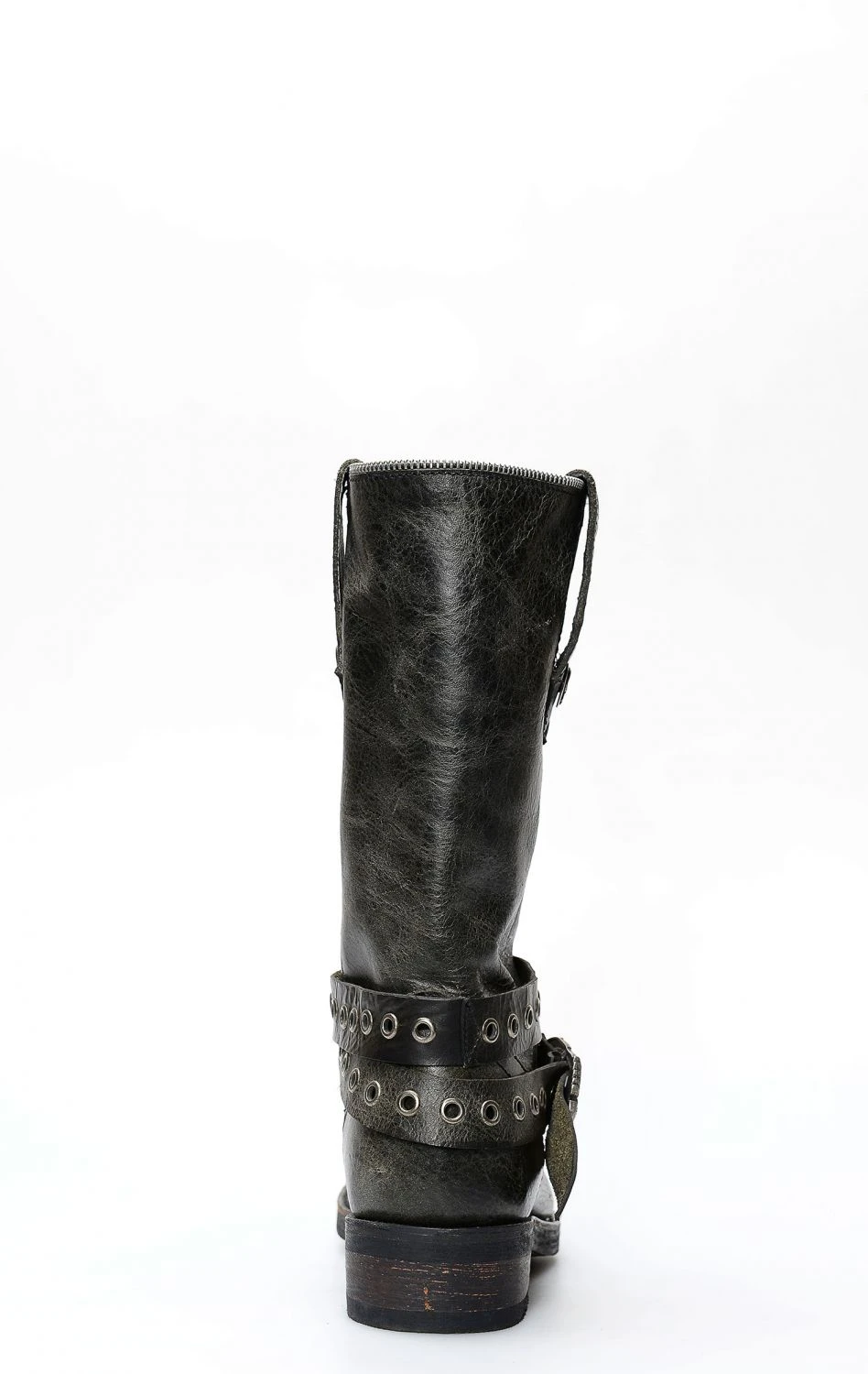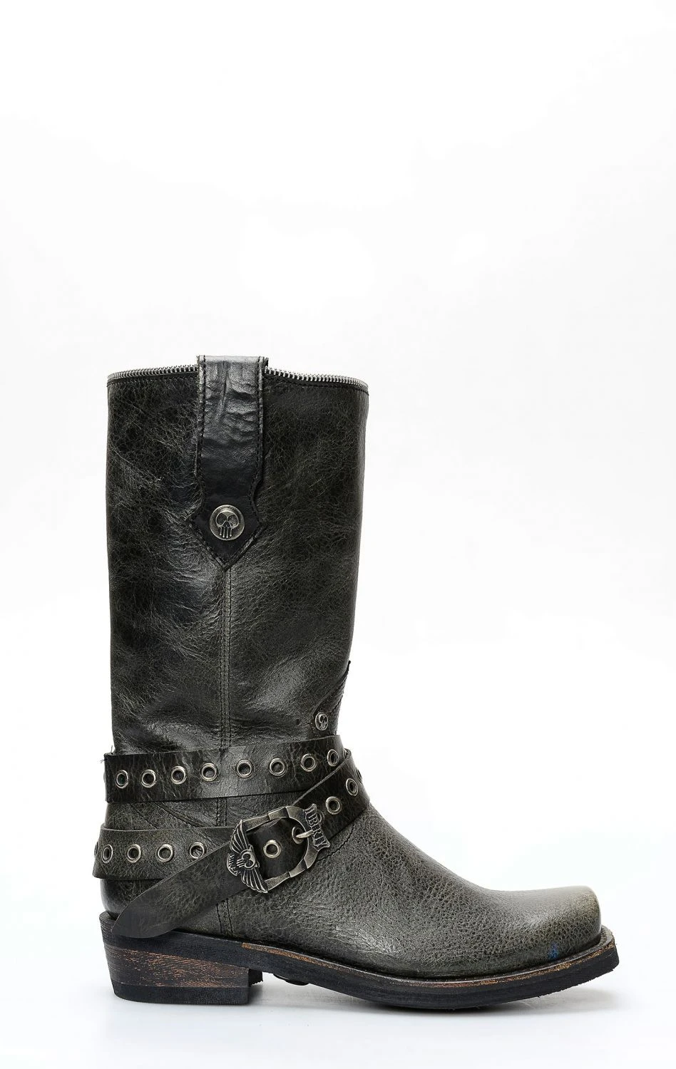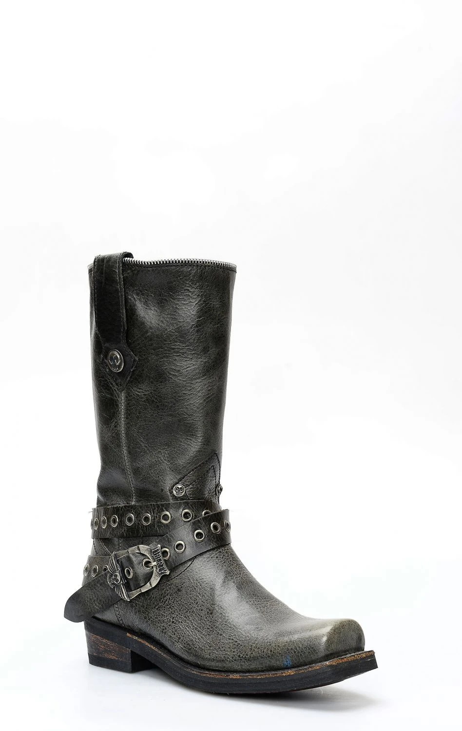 Stivali Liberty Black stile biker in pelle nera invecchiata. Cinturino borchiato rimovibile e punta squadrata. Suola tecnica in gomma. Perfetto per la moto e per il tempo libero.
