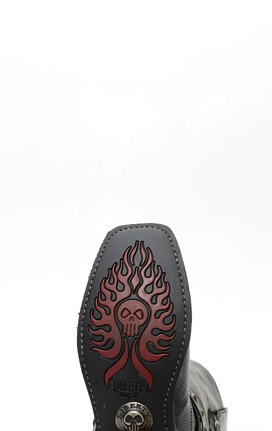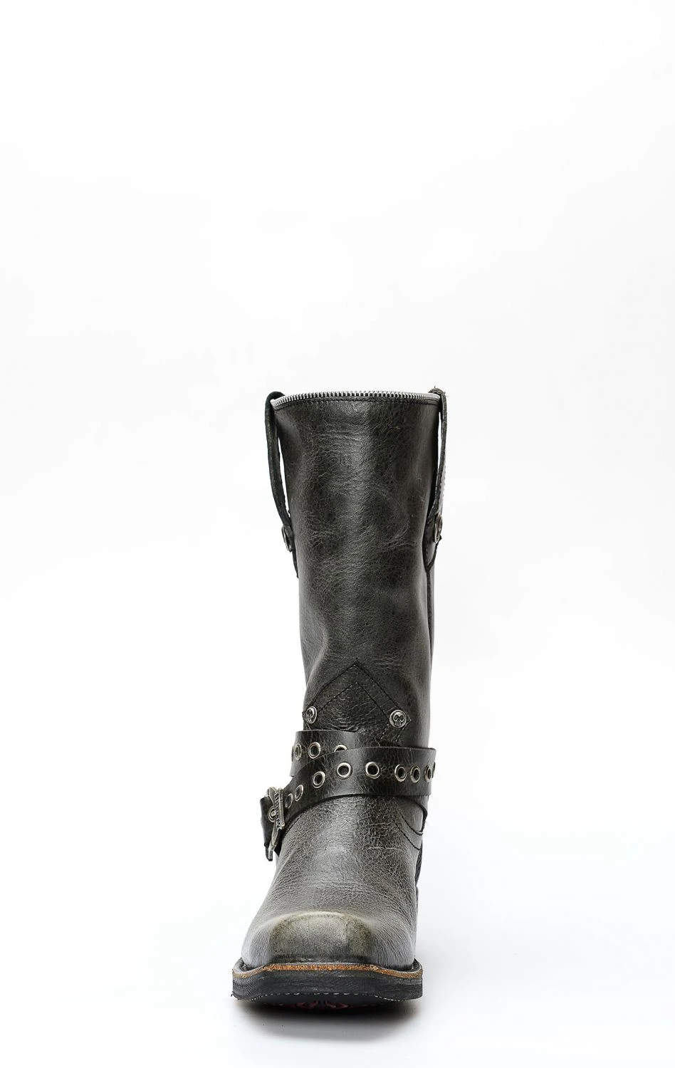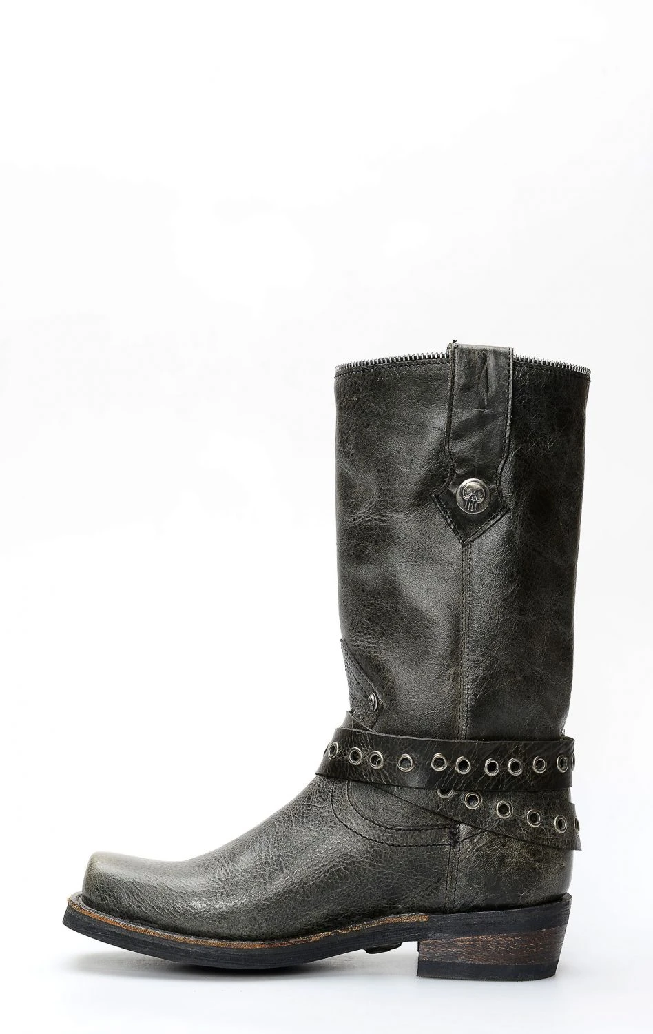 Stivali Liberty Black stile biker in pelle nera invecchiata. Cinturino borchiato rimovibile e punta squadrata. Suola tecnica in gomma. Perfetto per la moto e per il tempo libero.