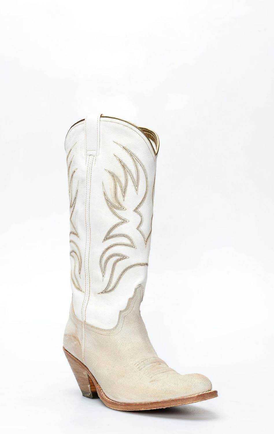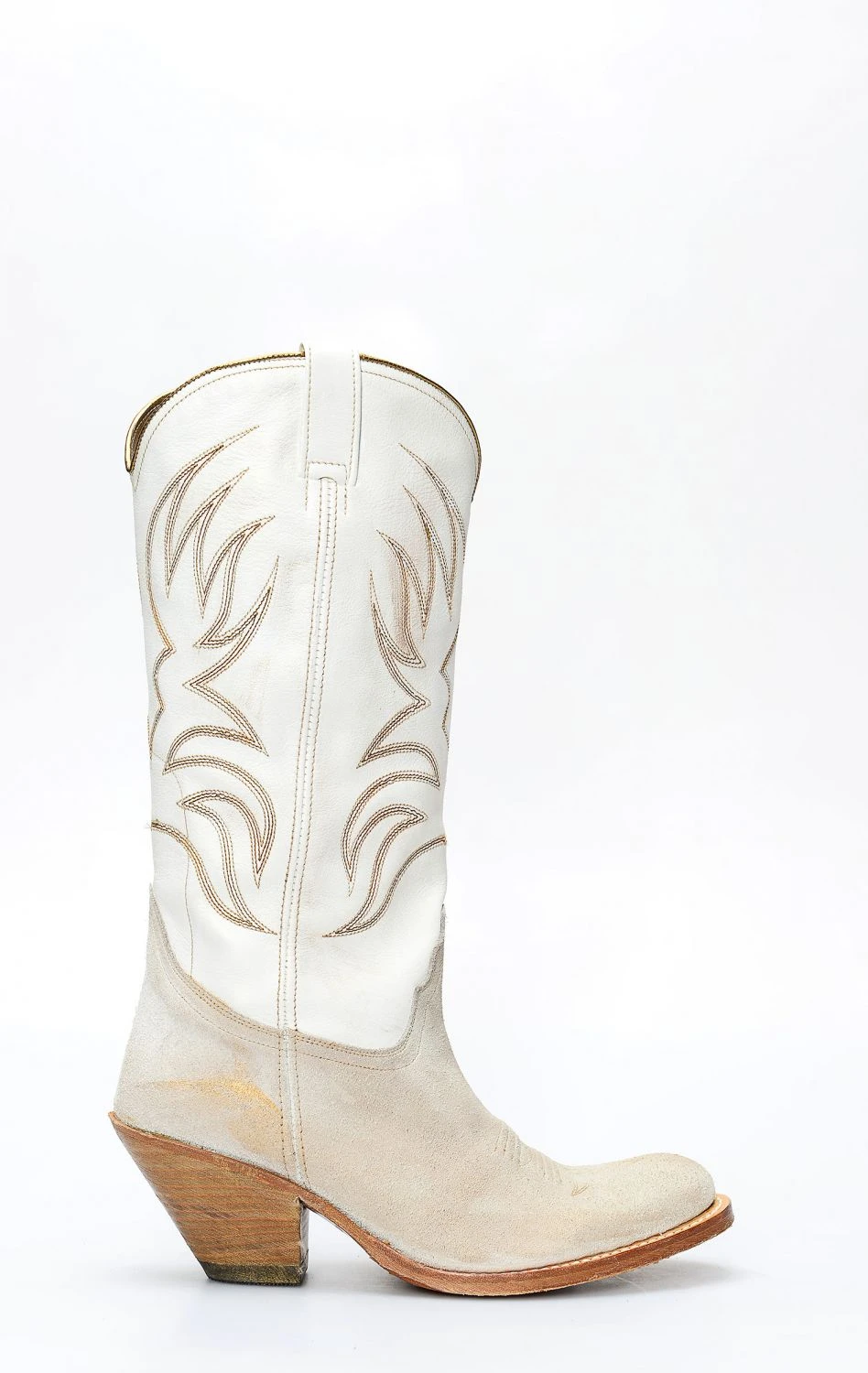 Stivale confezionato in pelle genuina di camoscio di colore bianco, completamente rifinito all’interno in fior di pelle e con suola in cuoio.