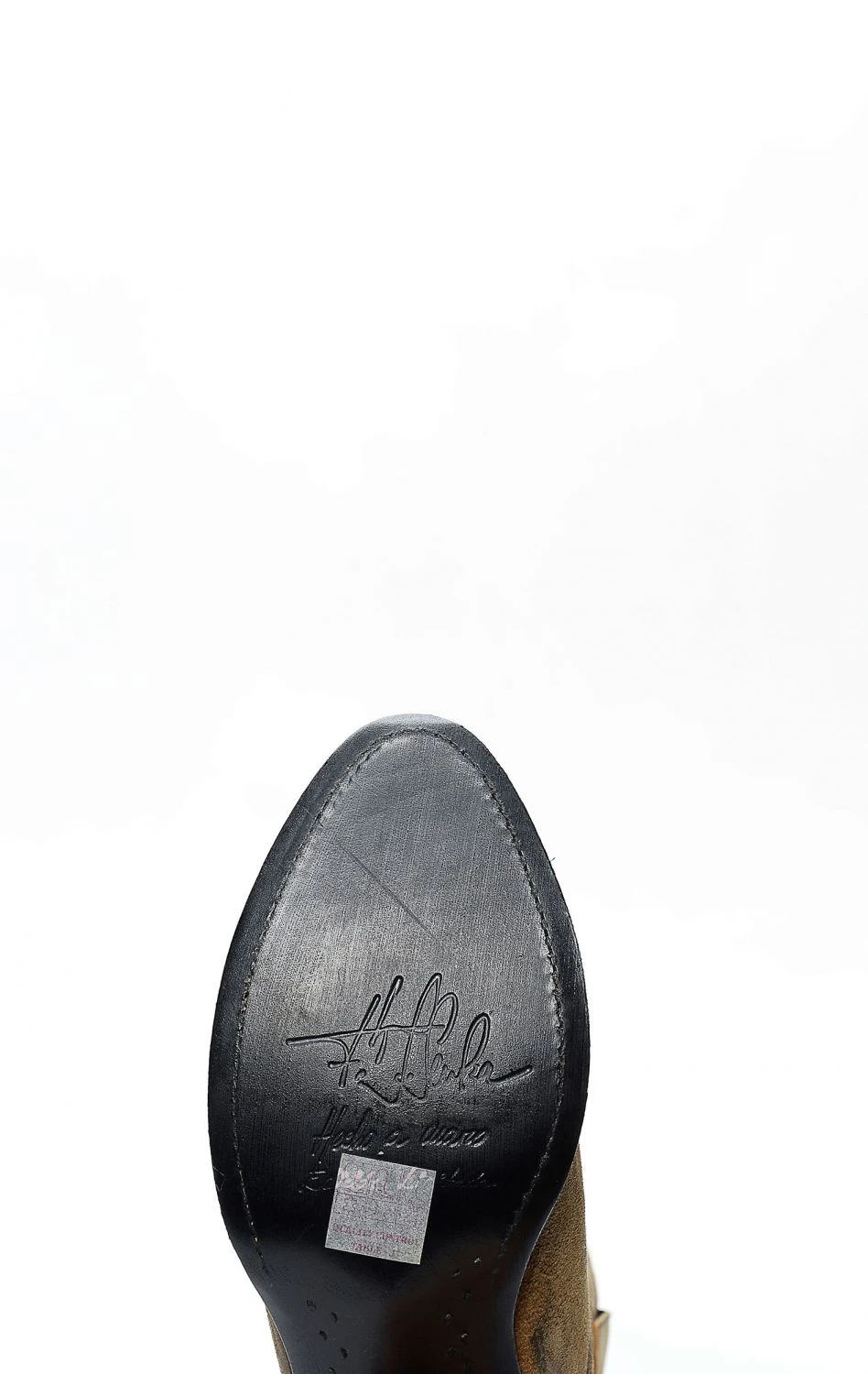 La punta ha la particolare conformazione medio rotonda mentre le misure sono approssimativamente di 37 cm per quel che riguarda l’altezza dello stivale, di 33 cm per quel che riguarda l’altezza del gambale, confezionato in pelle di vitello, e di 4 cm in merito alla misura del tacco.