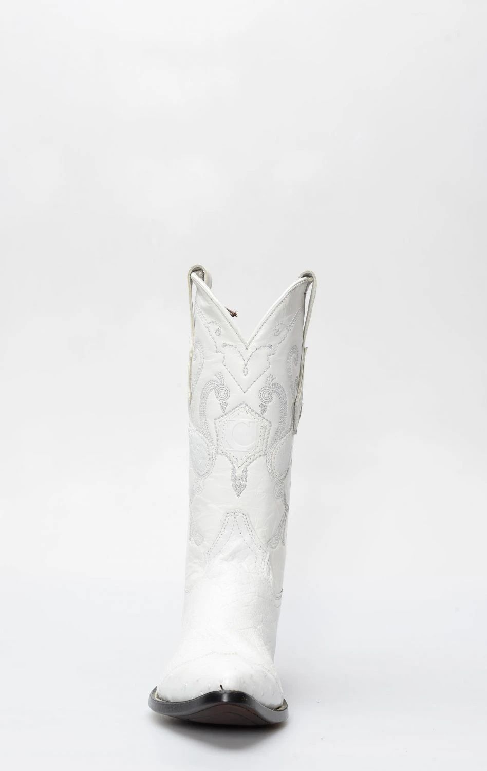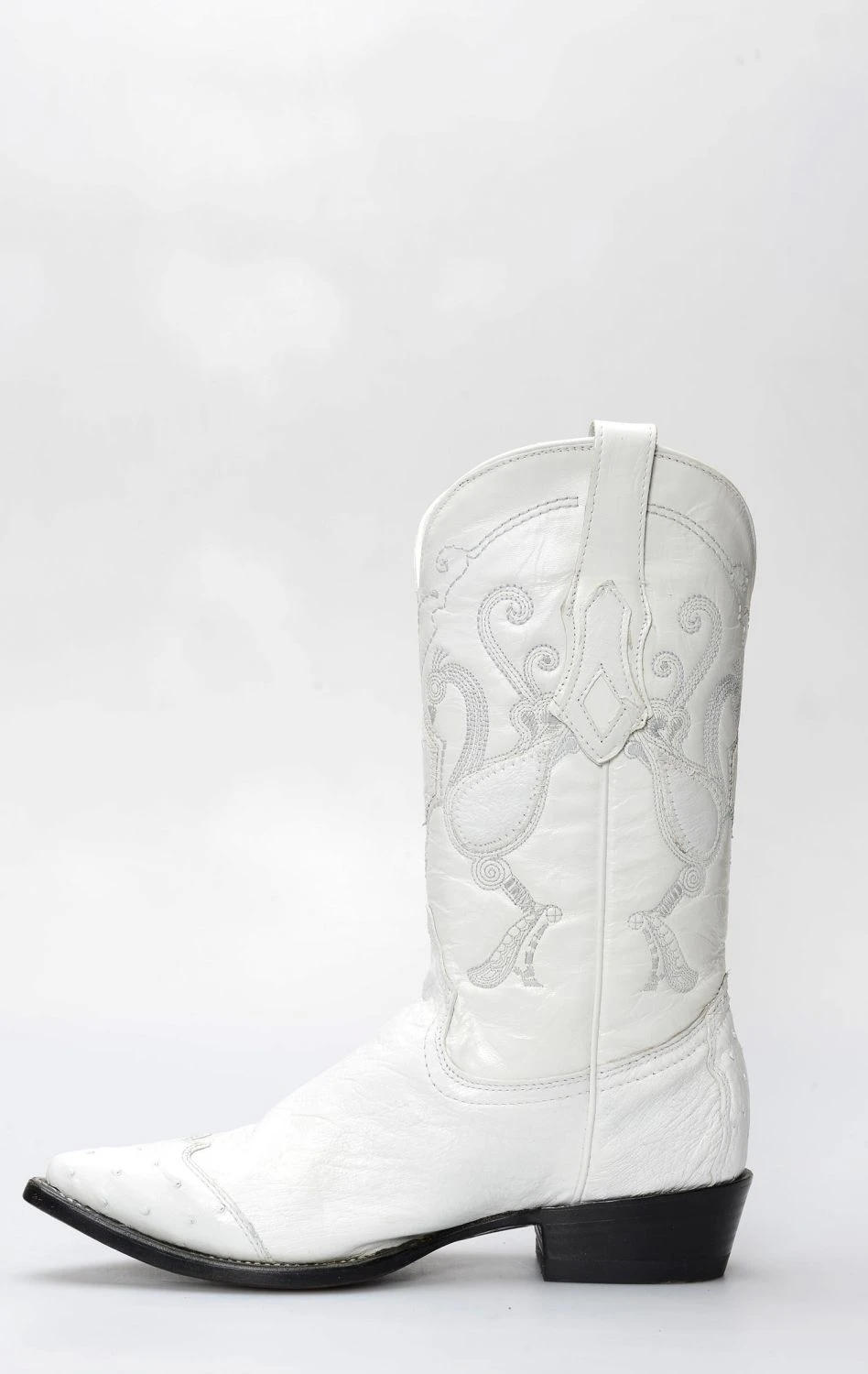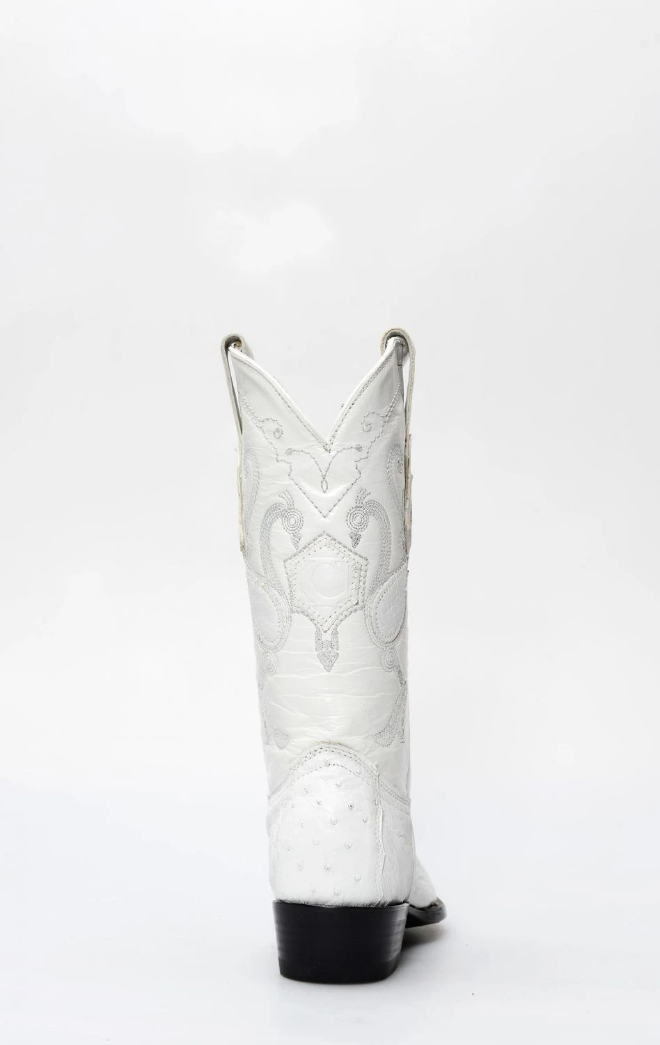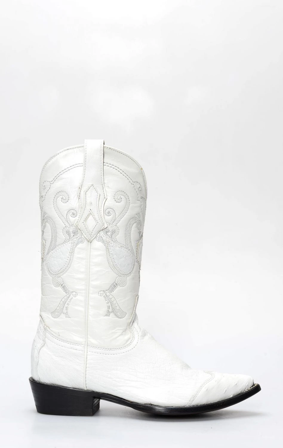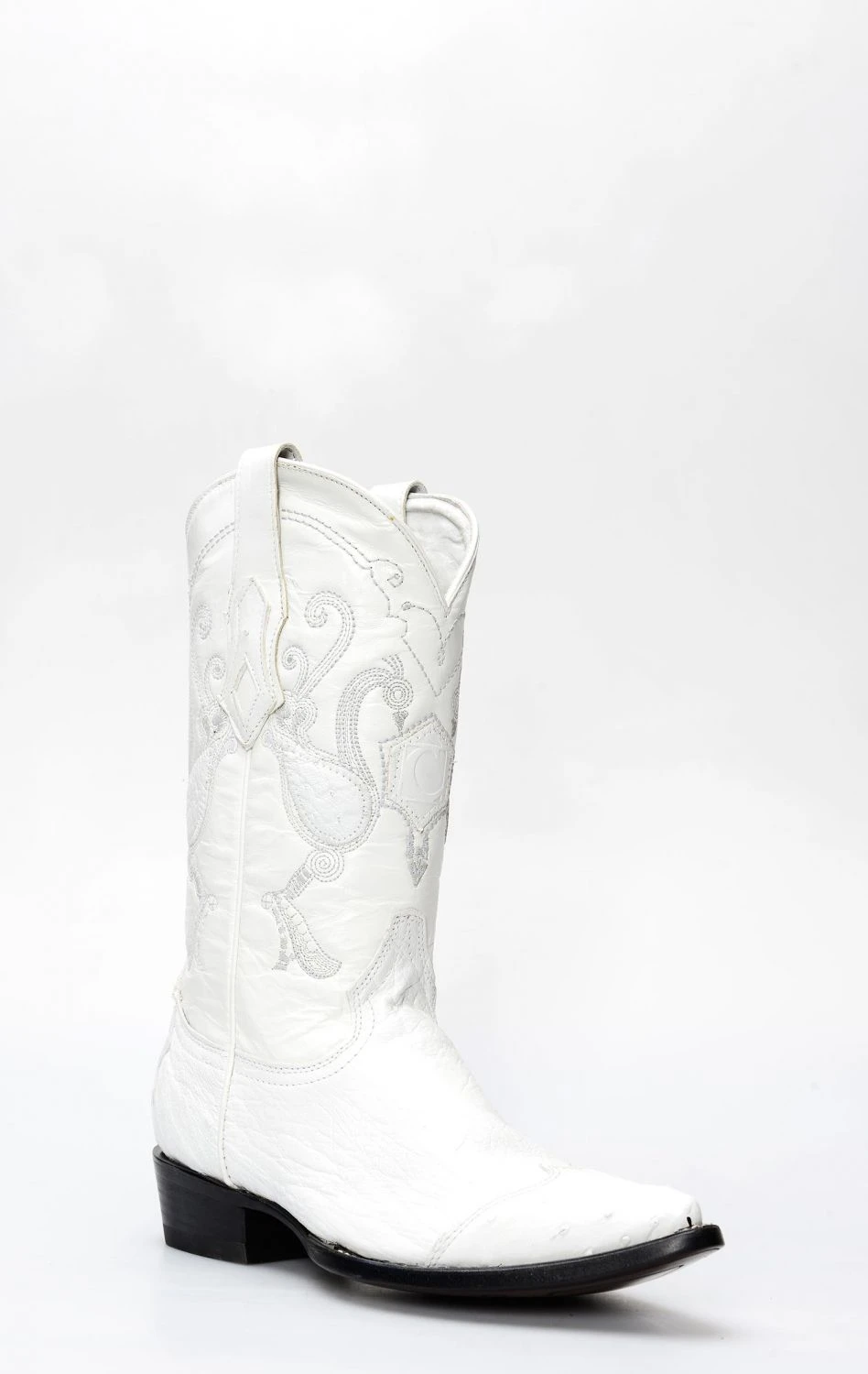stivale confezionato in vera pelle esotica, importata con regolare e speciale certificazione cites, di pancia di struzzo di colore bianco, completamente rifinito all’interno in fior di pelle e con suola in cuoio.