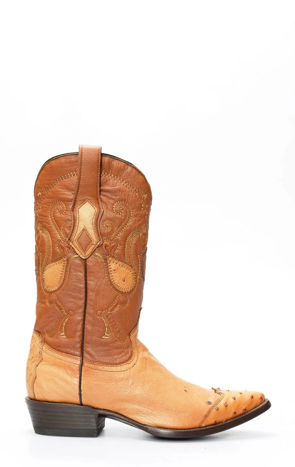 Stivali Cuadra color miele in pelle di pancia di struzzo con puntale in spalla. Finitura particolare per questo pellame sempre eccezionalmente confortevole.