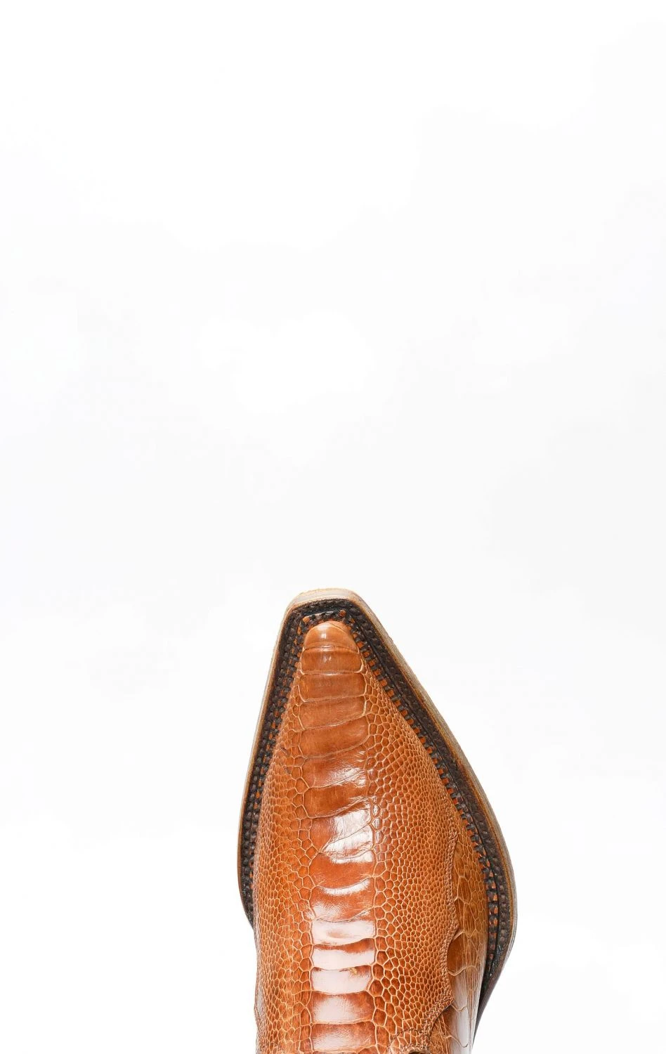 stivale confezionato in vera pelle esotica, importata con regolare e speciale certificazione cites, di gamba di struzzo di colore miele, completamente rifinito all’interno in fior di pelle e con suola in cuoio.