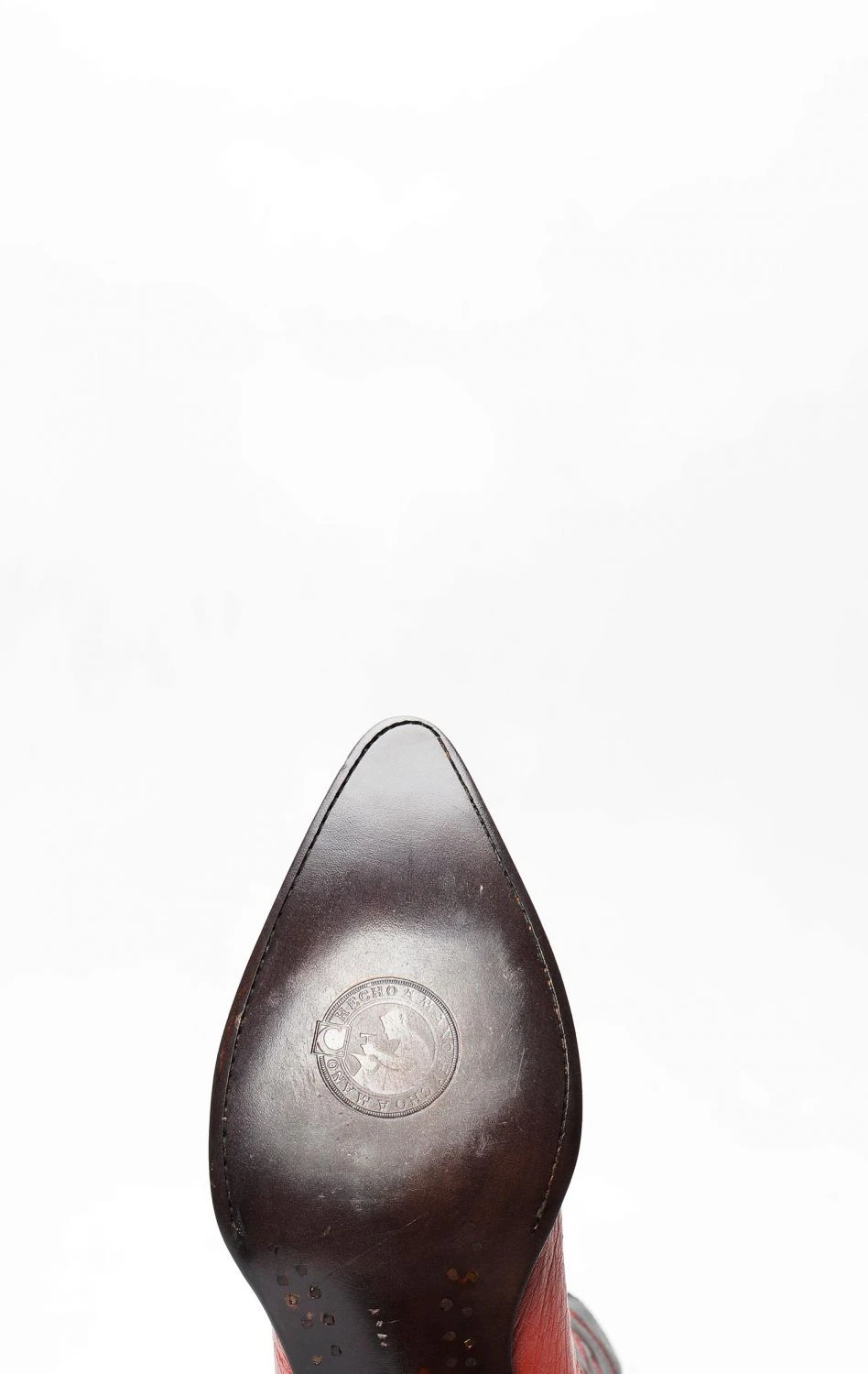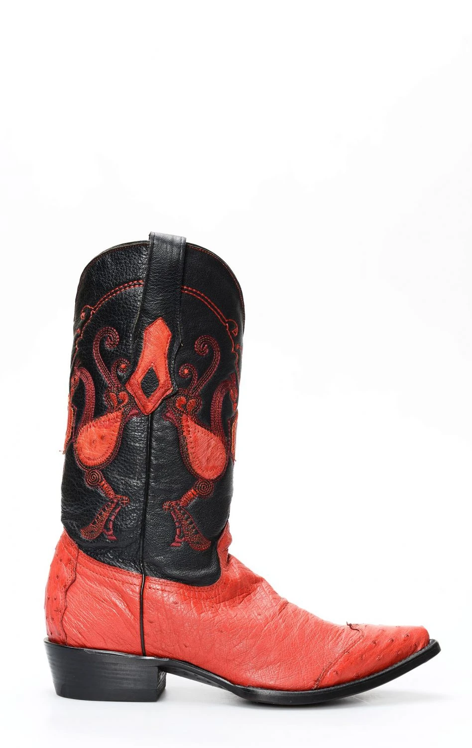 stivale confezionato in vera pelle esotica, importata con regolare e speciale certificazione cites, di pancia di struzzo di colore rosso, completamente rifinito all’interno in fior di pelle e con suola in cuoio.