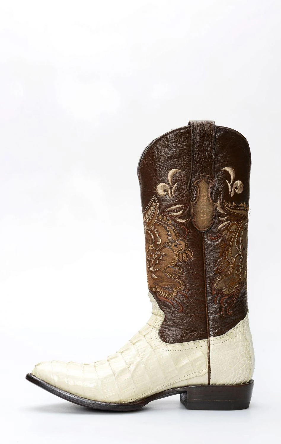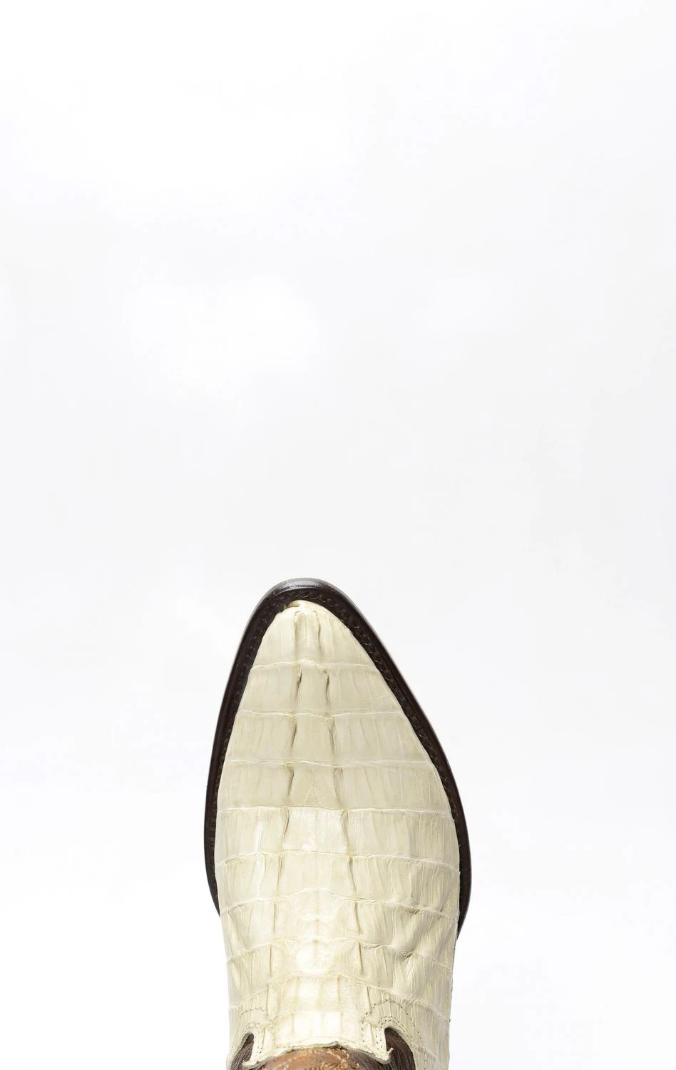 stivale confezionato in vera pelle esotica, importata con regolare e speciale certificazione cites, di coccodrillo di colore bianco lucido, completamente rifinito all’interno in fior di pelle e con suola in cuoio.