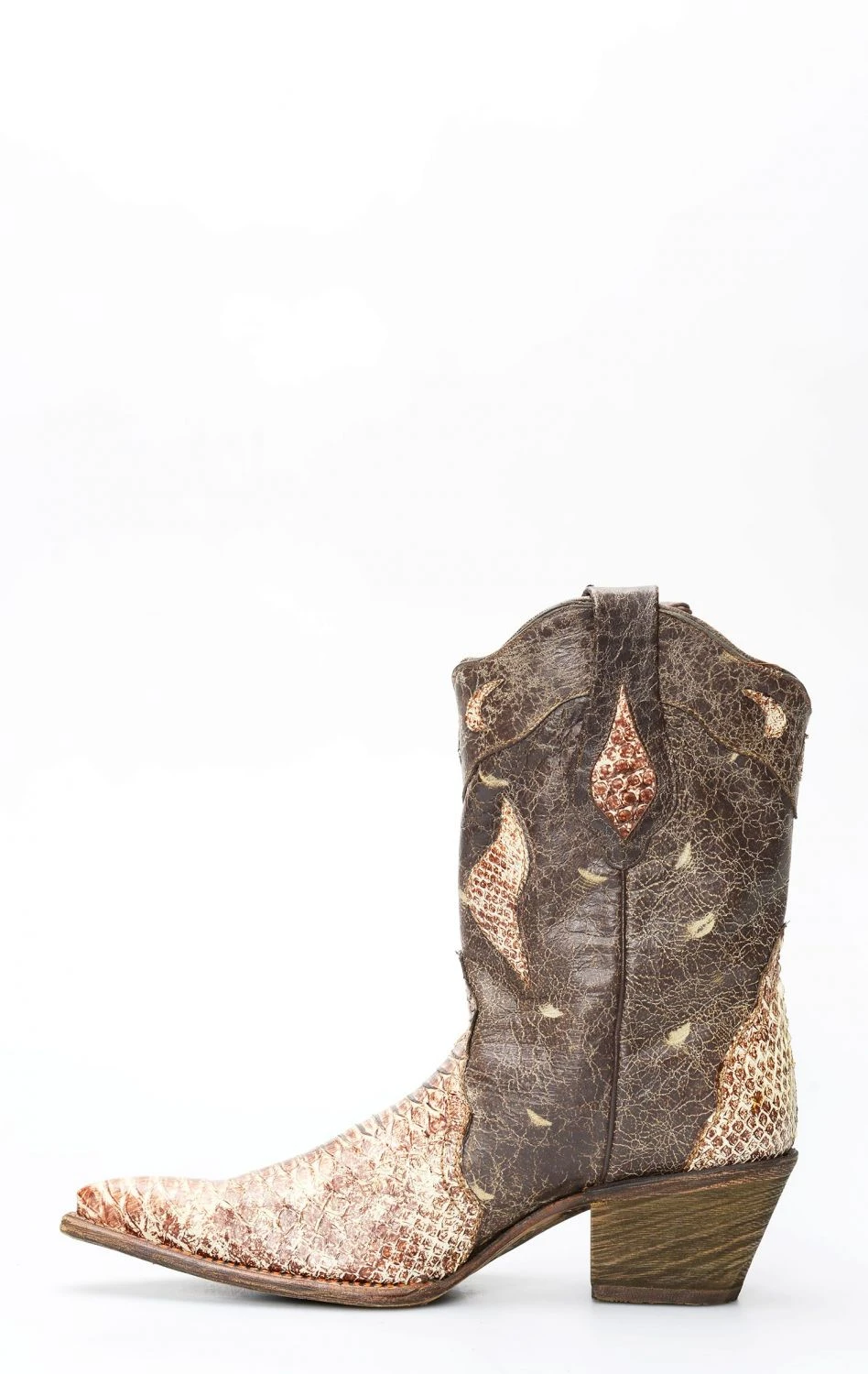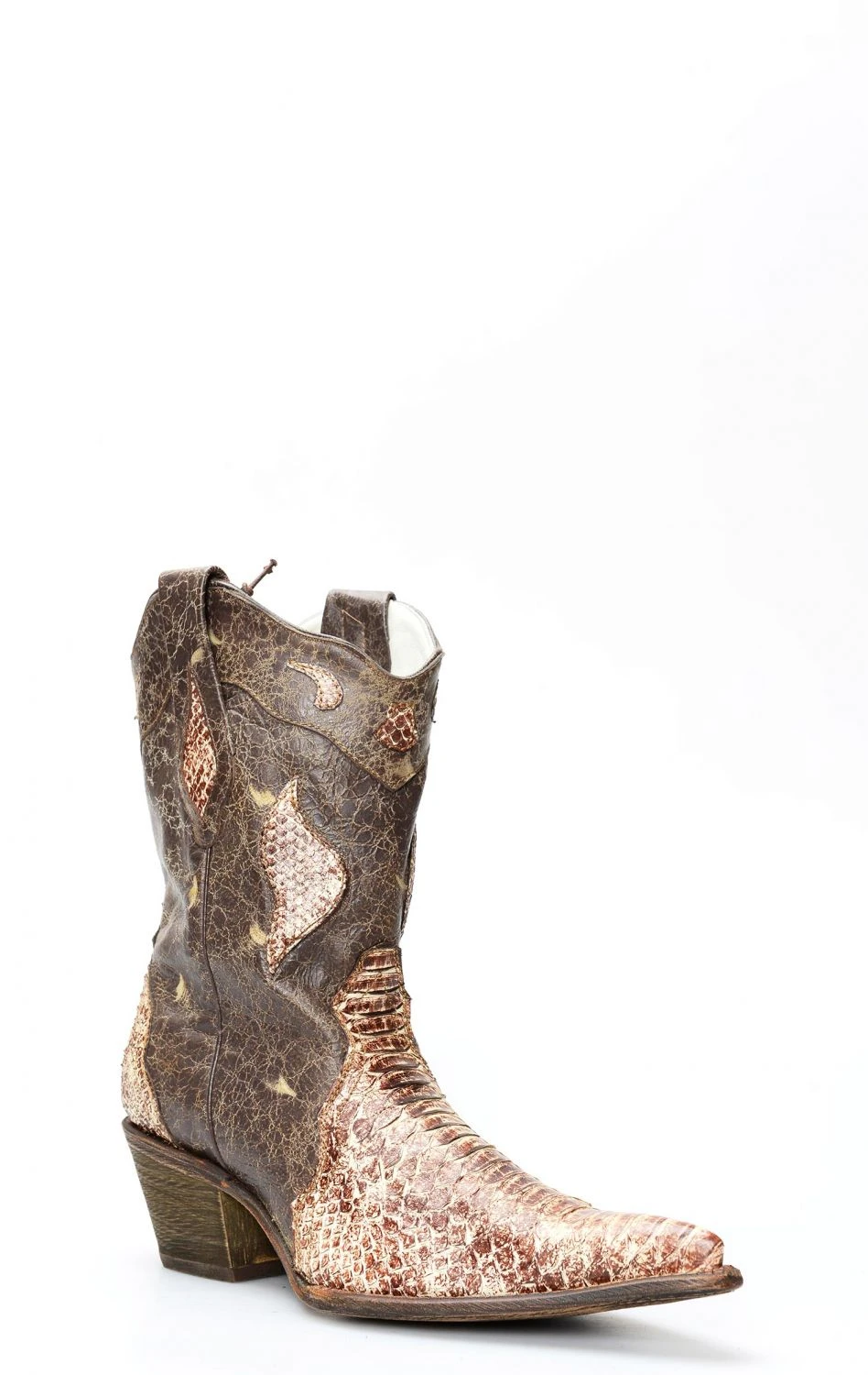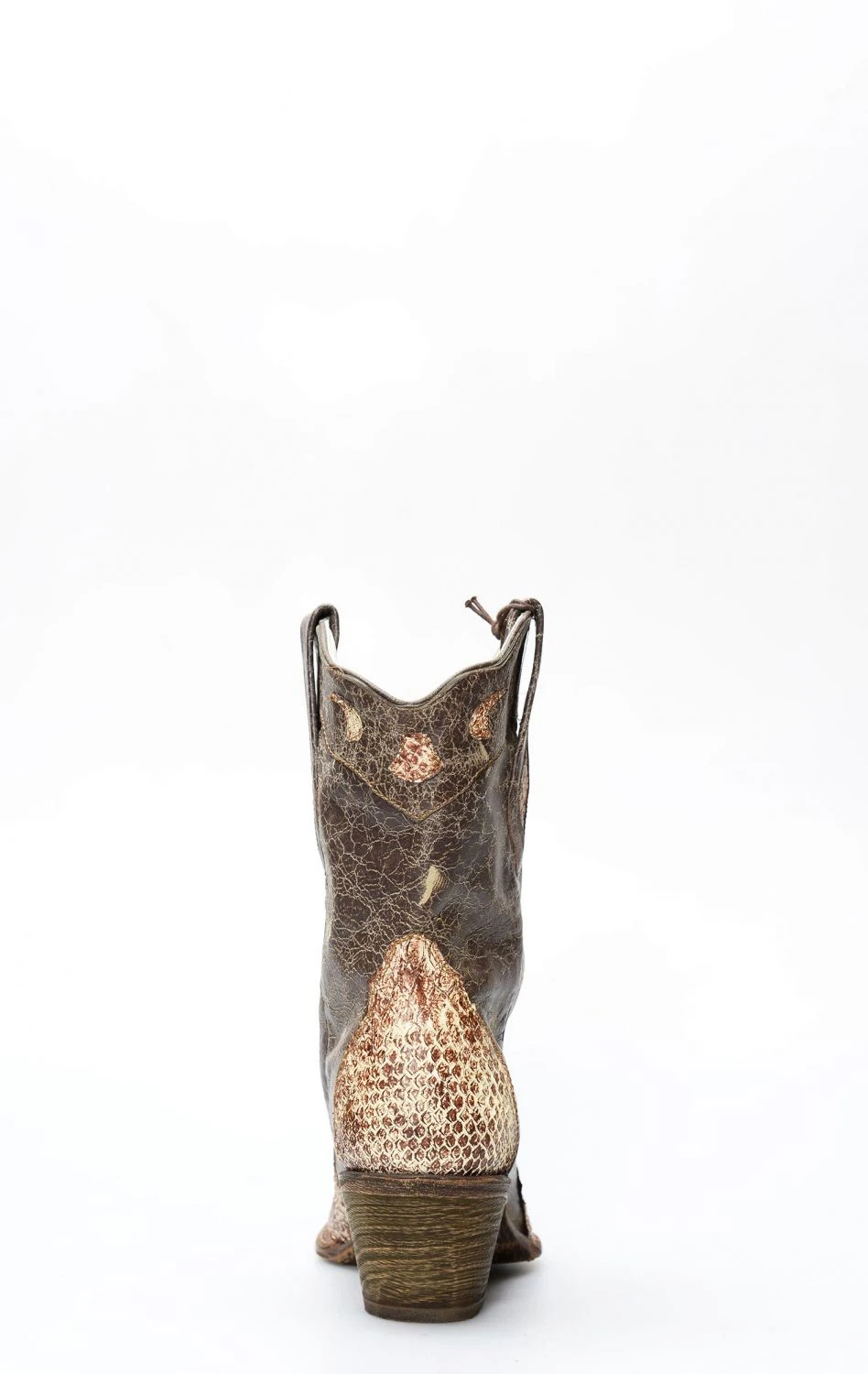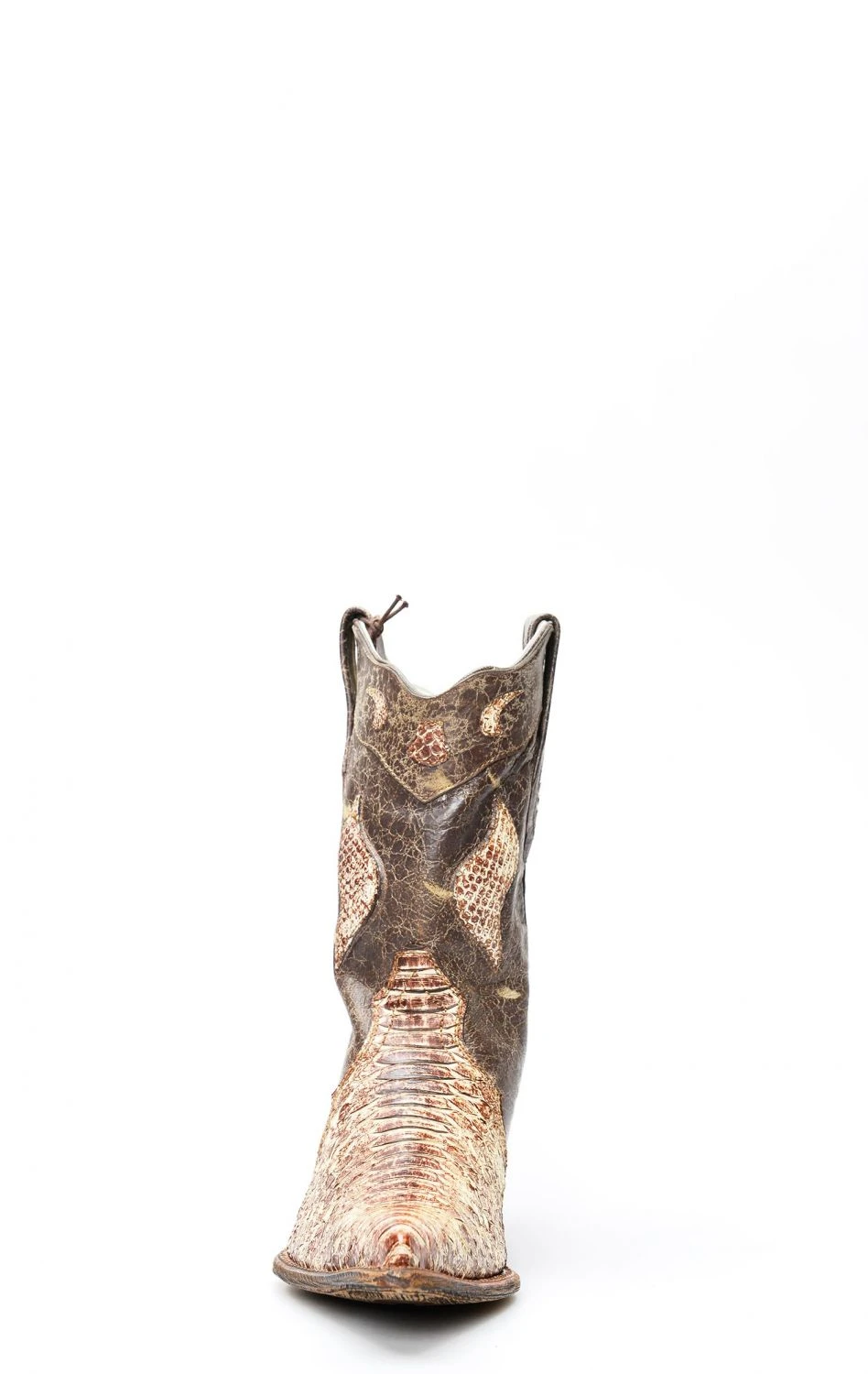 Stivali Frida by Cuadra marrone invecchiato in pelle di pitone. Tacco rialzato e gambale basso.