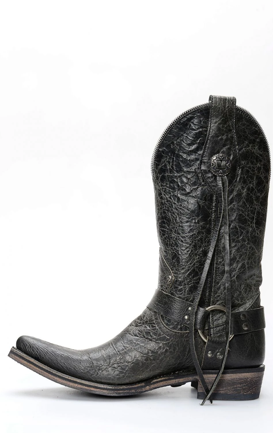 Stivale confezionato in pelle genuina di vitello di colore nero, completamente rifinito all’interno in fior di pelle e con suola in cuoio con ricamo antiscivolo e concho.