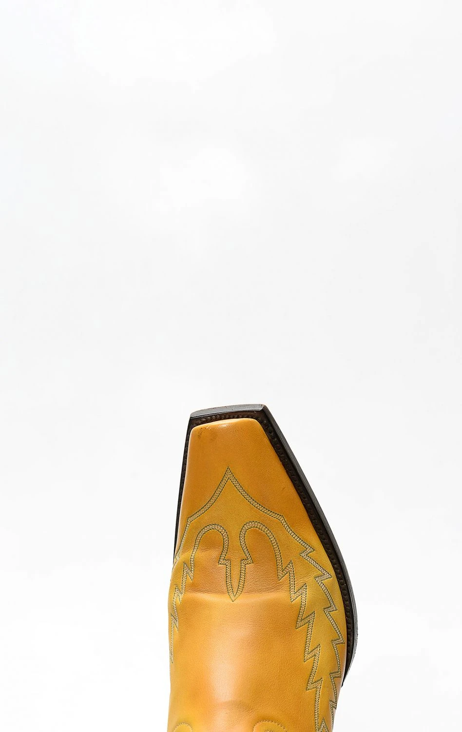 Stivale confezionato in pelle genuina di vitello di colore giallo, completamente rifinito all’interno in fior di pelle e con suola in cuoio.