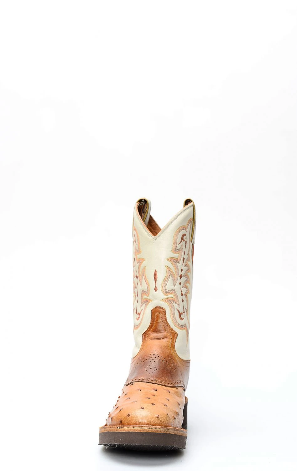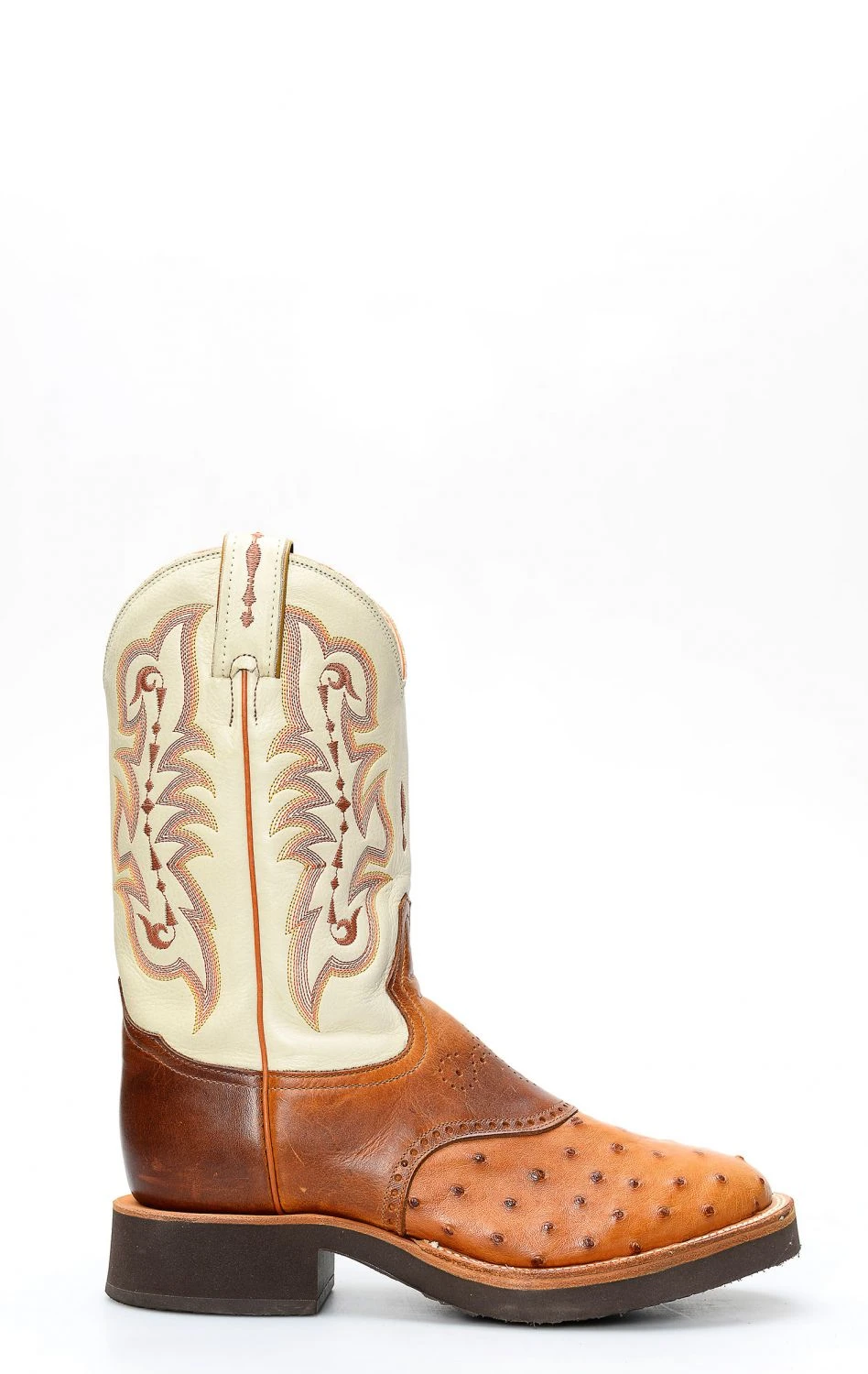 Stivali Tony Lama da lavoro in spalla di struzzo marrone e gambale chiaro. Punta rotonda e suola tecnica in gomma.