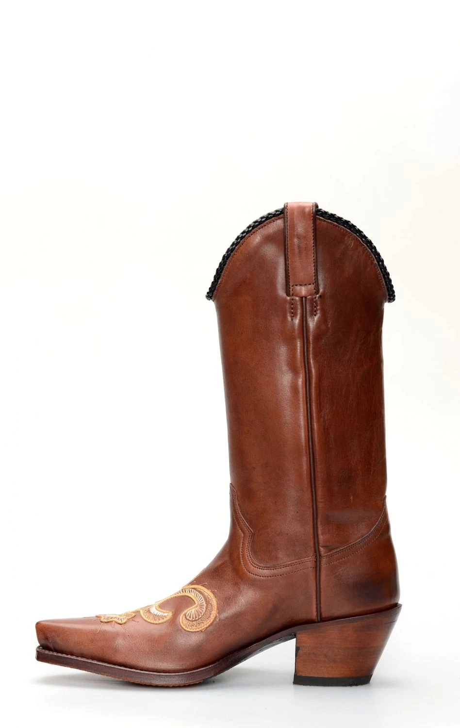 Stivale confezionato in pelle genuina di vitello di colore cuoio naturale, completamente rifinito all’interno in fior di pelle e con suola in cuoio.