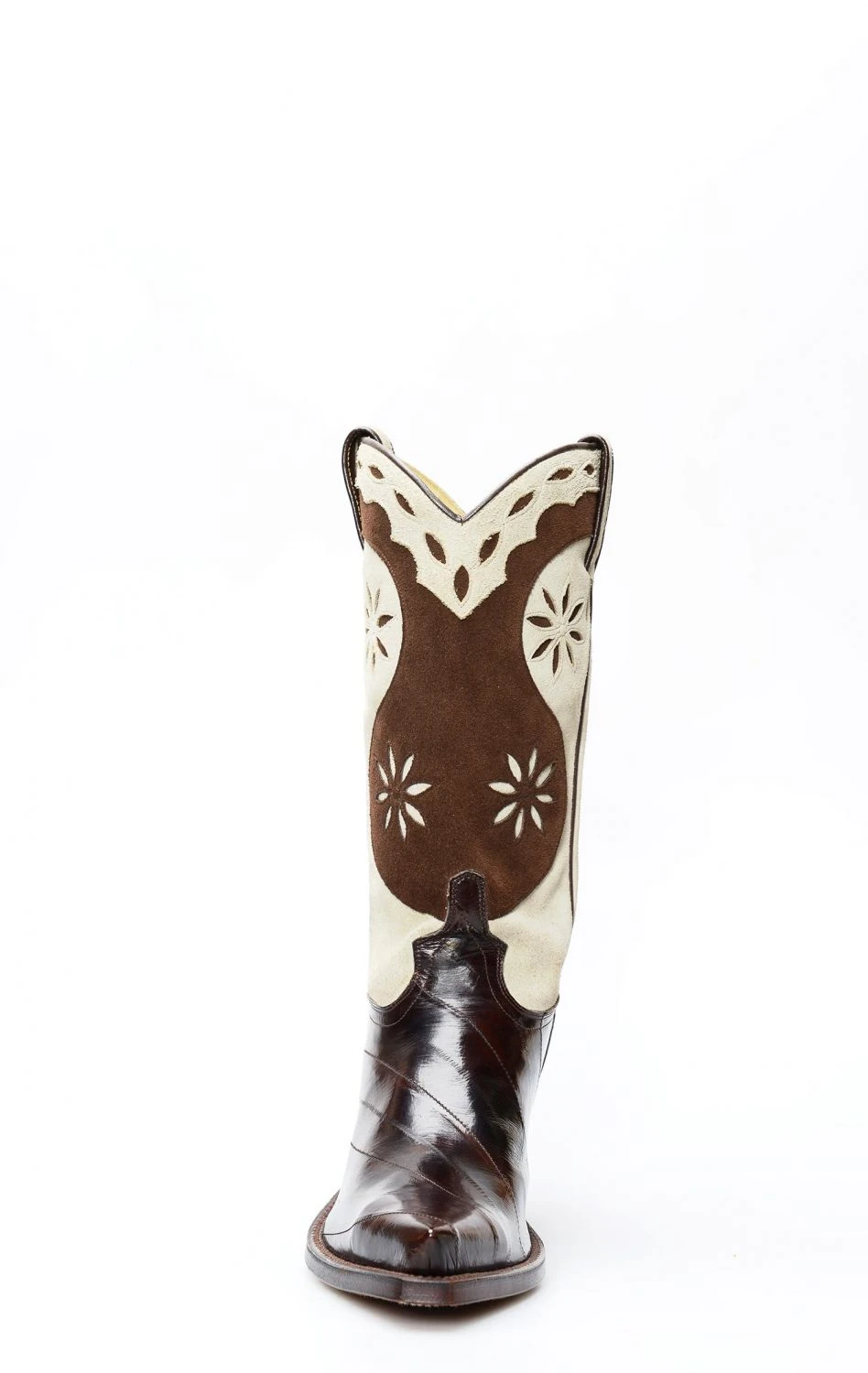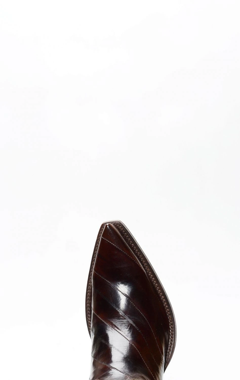 Stivale confezionato in pelle genuina di anguilla di colore marrone, completamente rifinito all’interno in fior di pelle e con suola in cuoio.