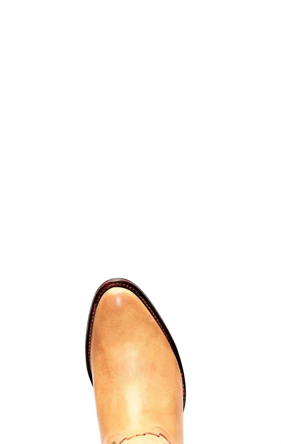 La punta ha la classica conformazione a j mentre le misure sono approssimativamente di 36,5 cm per quel che riguarda l’altezza dello stivale, di 32 cm per quel che riguarda l’altezza del gambale, confezionato in pelle di bok brash, e di 5 cm in merito alla misura del tacco.